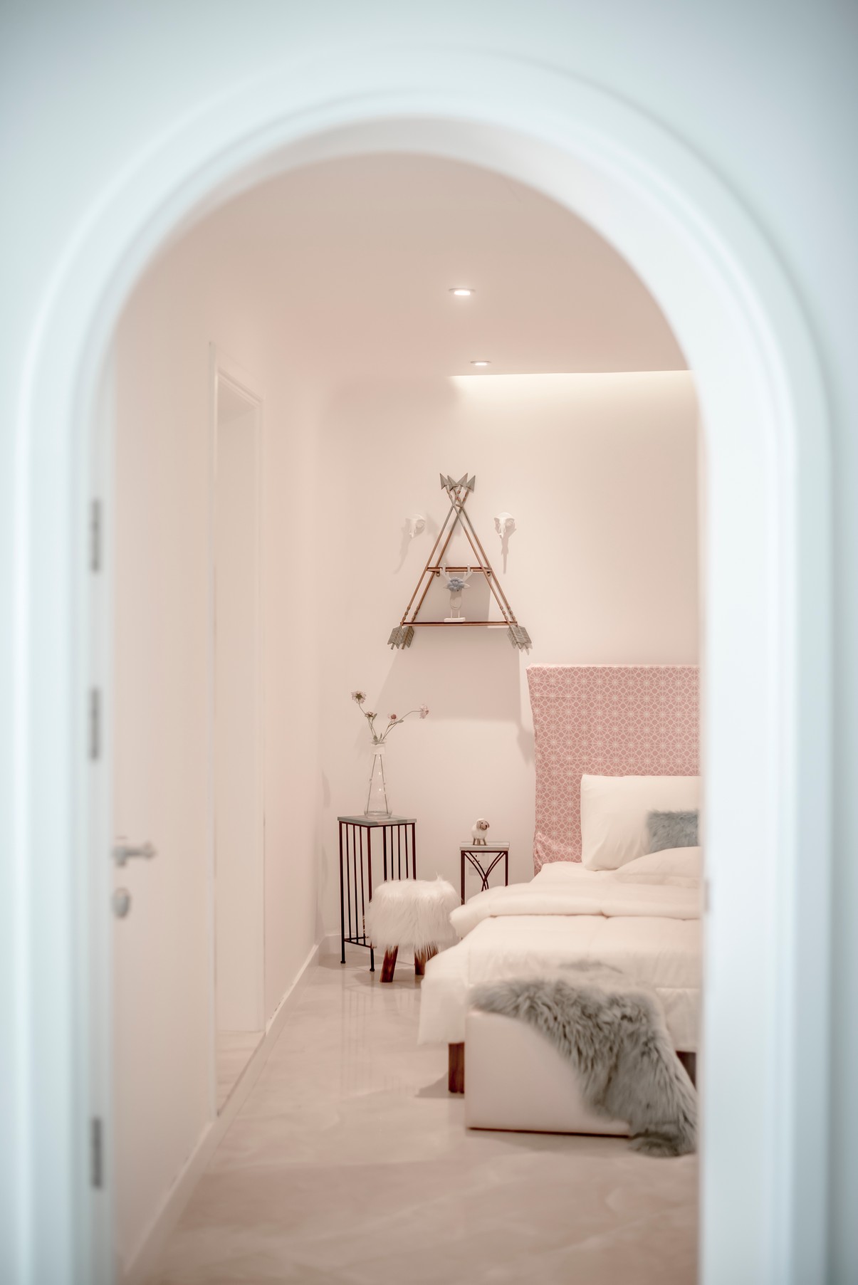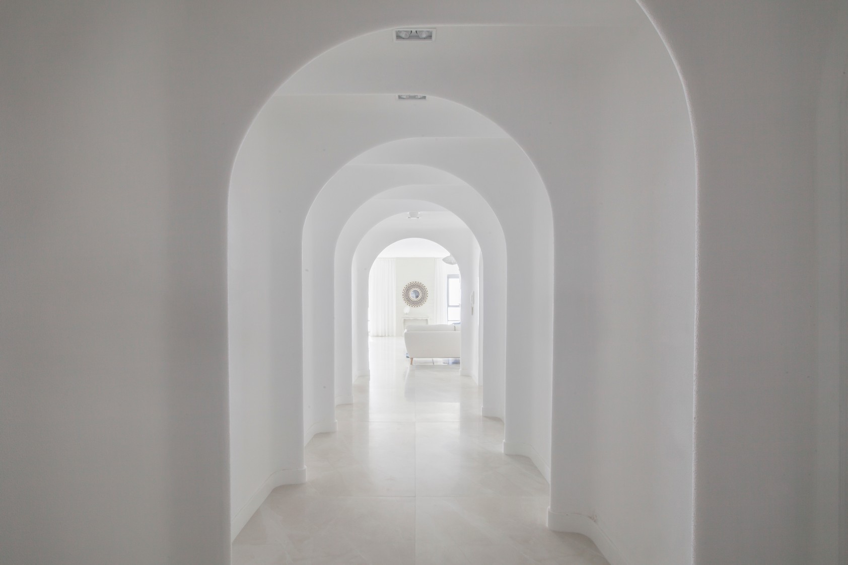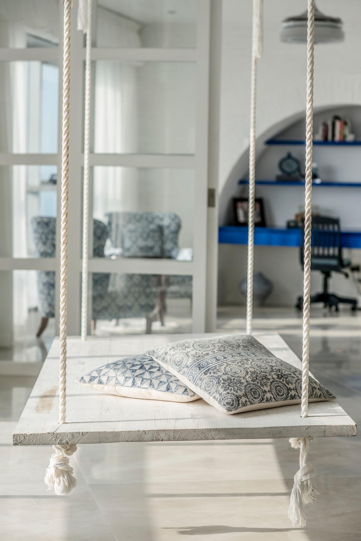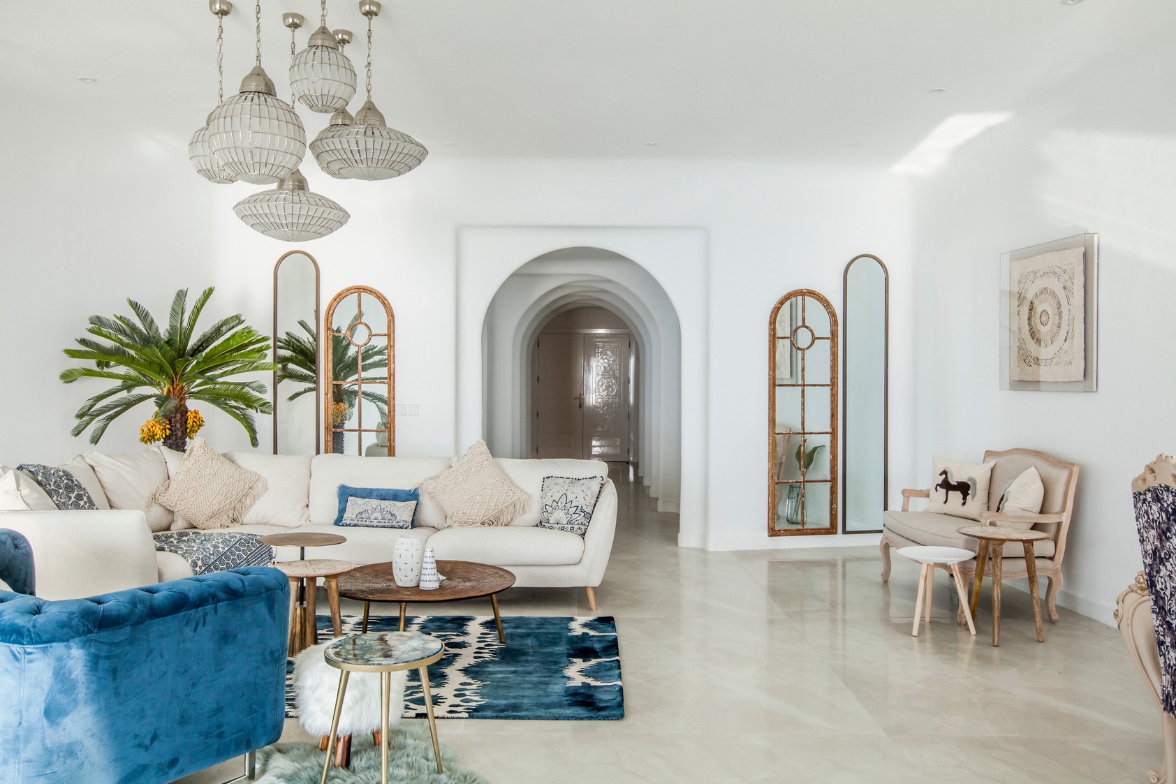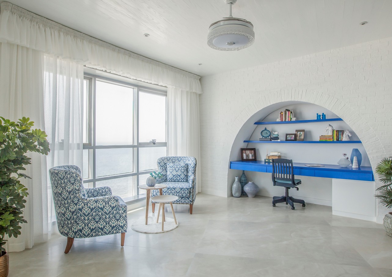 This 4,600 square feet apartment is a 4BHK in a high rise building along the corniche in Ajman, UAE. With curved walls, grand arches, mutes tones of white met with the occasional burst of blue - from the paint as well as the grand seafront view, it is a private Santorini inspired Oasis right in the middle of the desert!