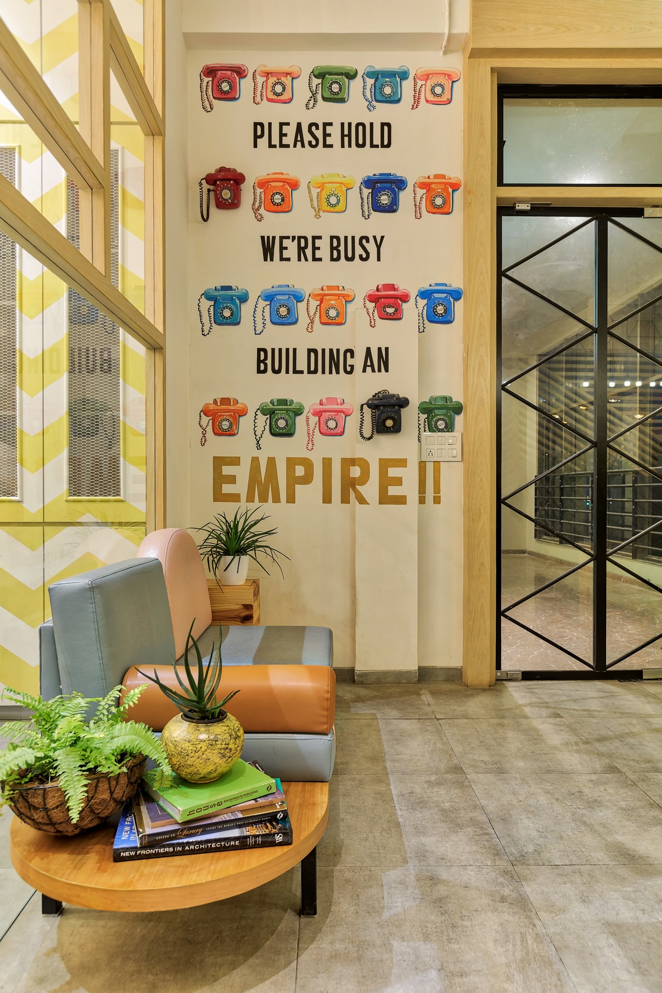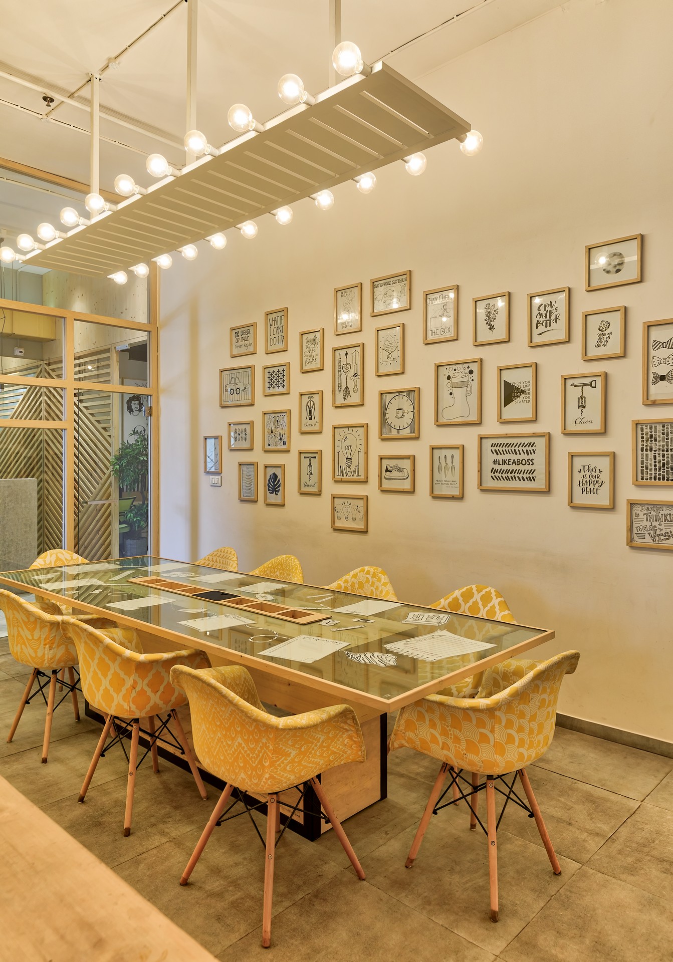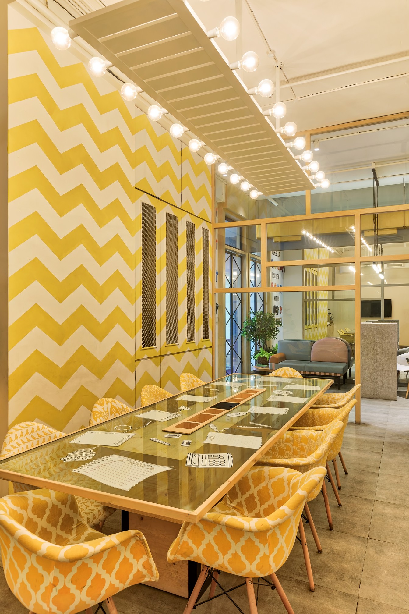 The 3500 square feet office claims its space stretching across a whole floor at Orion, a high rise corporate building nestled in Santa Cruz east. The bare office already had a touch of grandeur with its high ceiling and sprawling area, that we transformed with bursts of colours and elements of quirk so that the space could mimic Milind Soman's spirit and charm.
