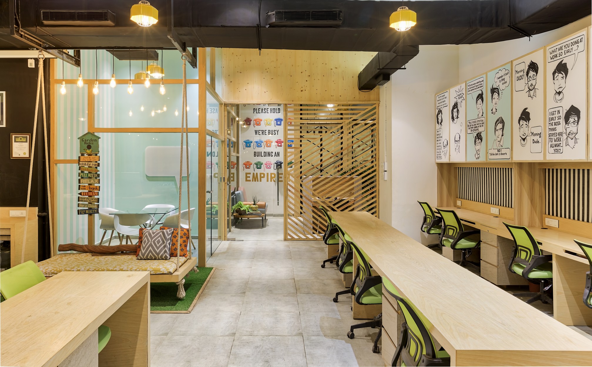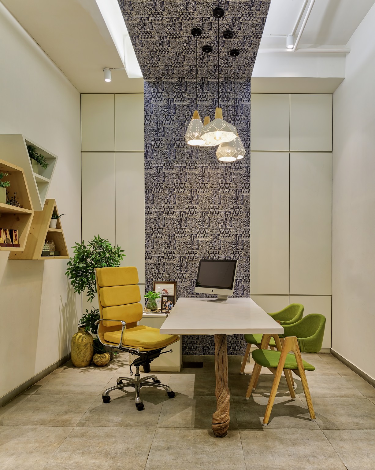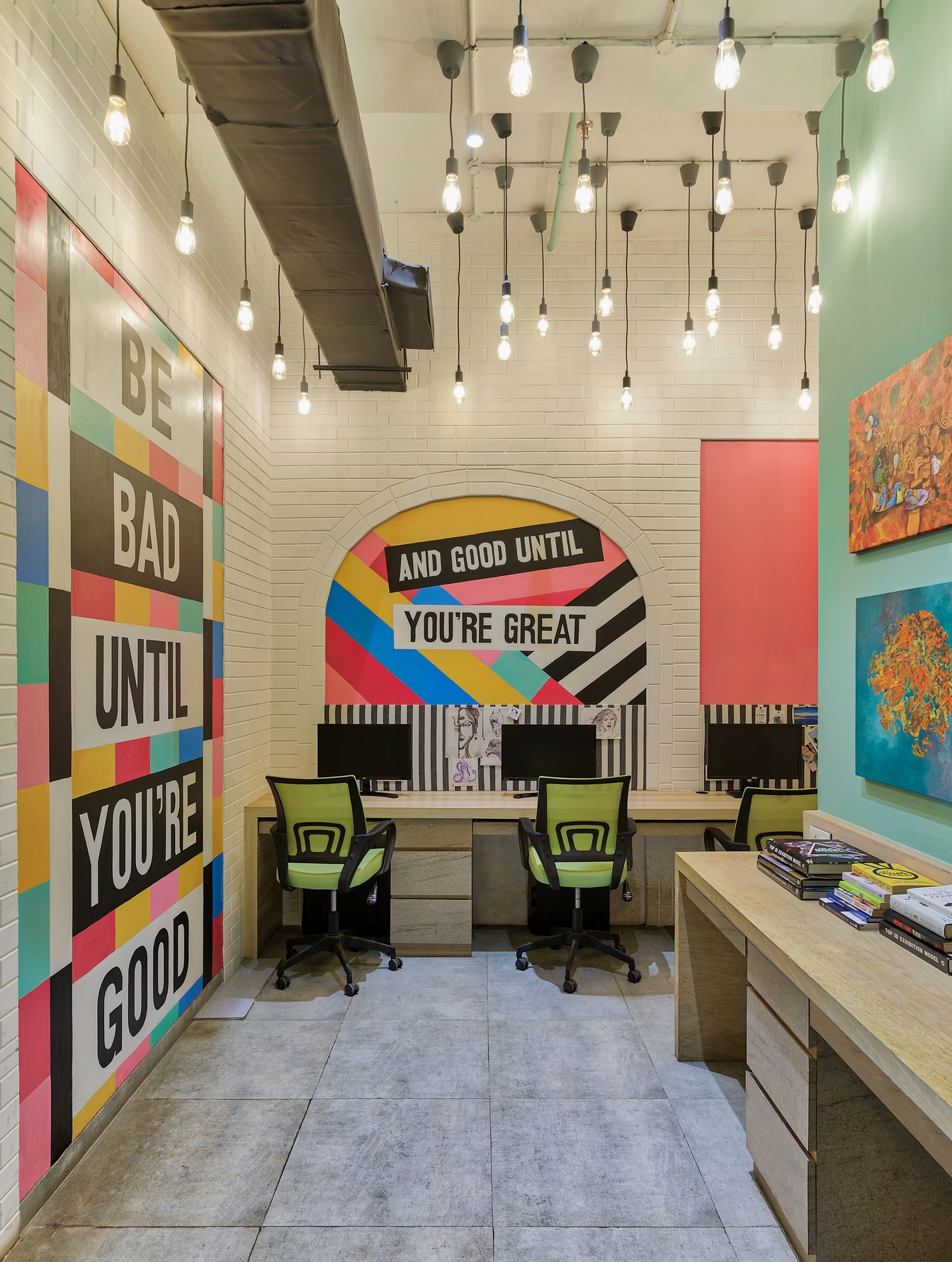 The 3500 square feet office claims its space stretching across a whole floor at Orion, a high rise corporate building nestled in Santa Cruz east. The bare office already had a touch of grandeur with its high ceiling and sprawling area, that we transformed with bursts of colours and elements of quirk so that the space could mimic Milind Soman's spirit and charm.
