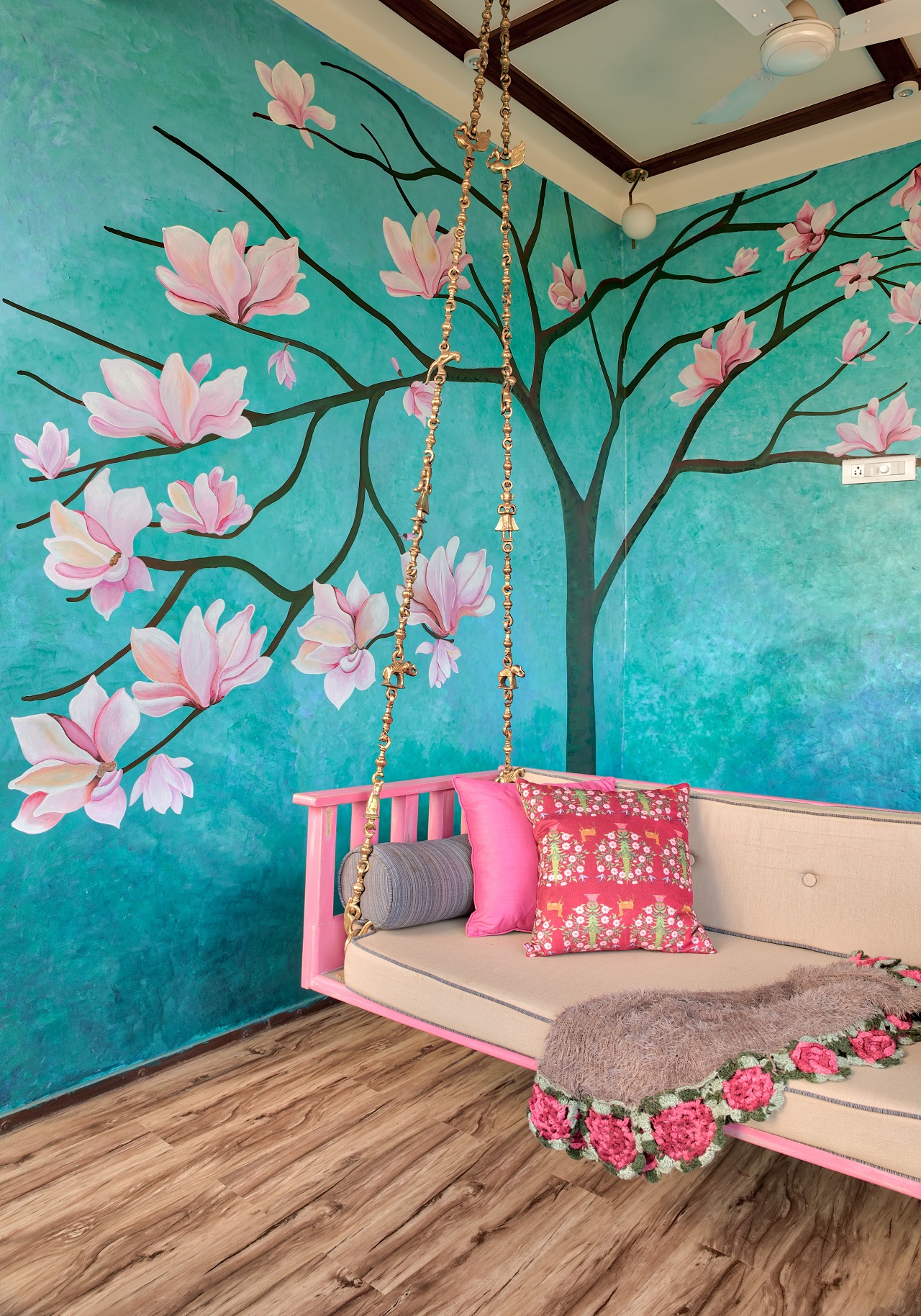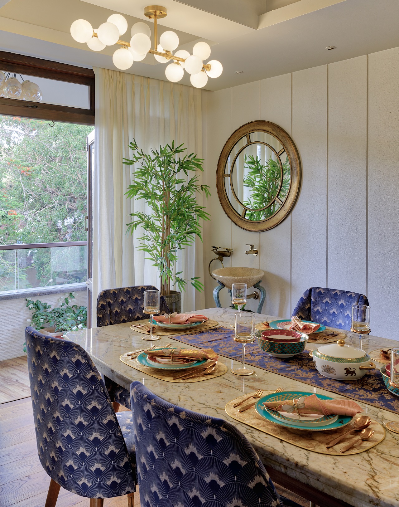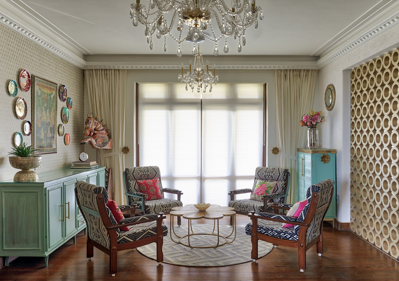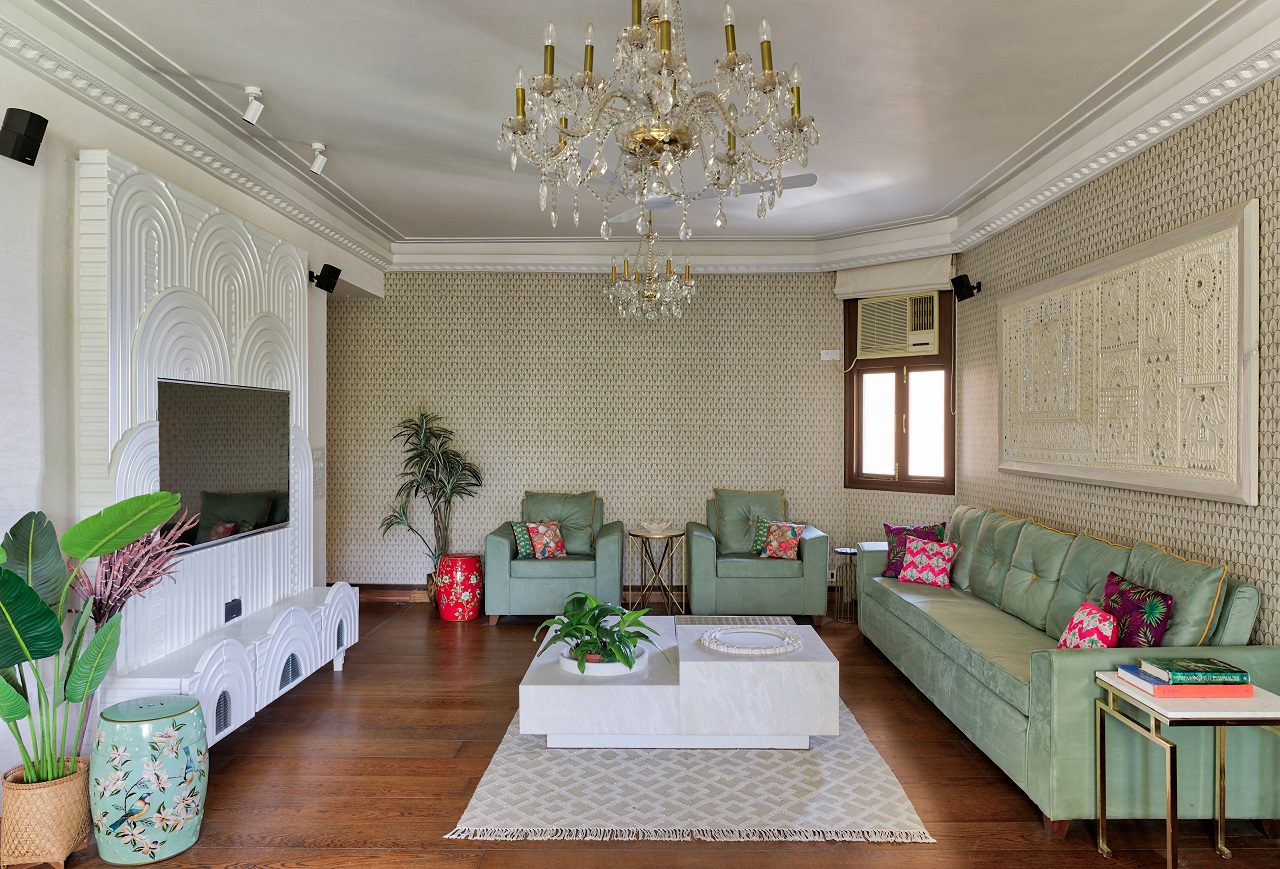 Shubhika Davda’s Residency is a lovely 3,000 square foot 3Bhk house located on the highest plot of Malabar hill in Mumbai. It has breathtaking views of the Arabian Sea on one side and the Parsi Tower of Silence on the other. As soon as we saw the space we knew we have to maintain the old charm of this space yet represent its modern inhabitants. That was achieved by maintaining the backdrop of the house in plain white. The wall finishes and fixed furniture pieces were in all white - highlighted only through textures, forms, levels, carvings, moldings and self prints. To represent the personality of the women in the house, we brought in bright and bold colors and patterns through the upholstery, furniture and art.