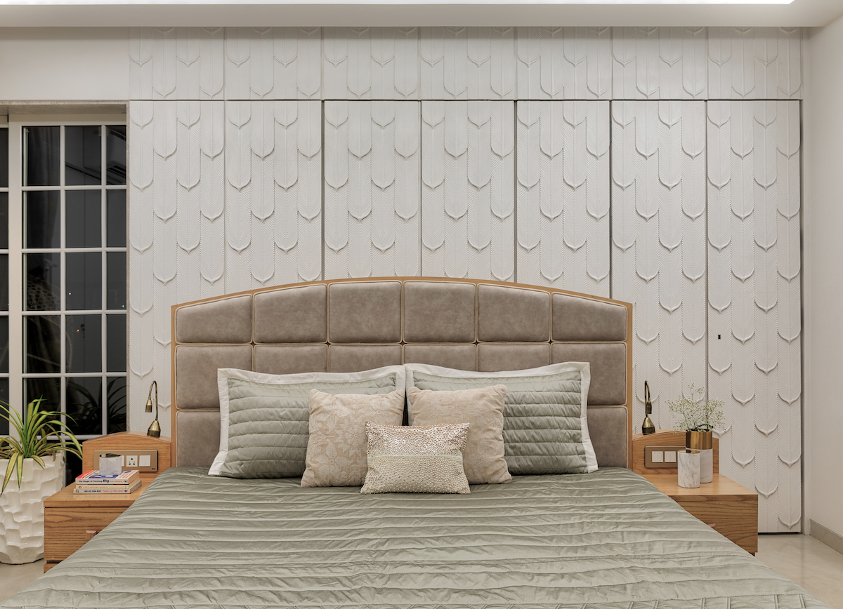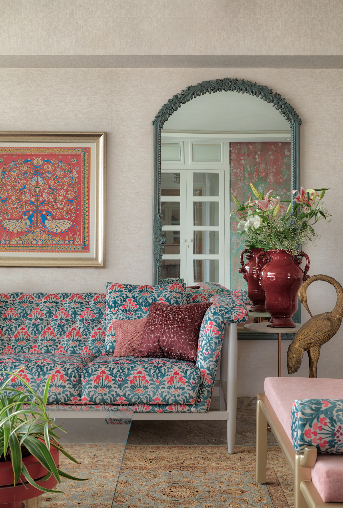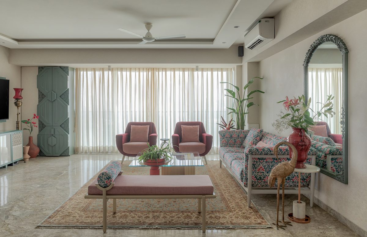 This 4bhk residence located in the heart of Mumbai offers a serene vision of green landscape amidst the hustle of the city. The residents inspired Design Hex to create a joyful space through patterns, prints and colours while balancing the element of subtlety and elegance. They wished to step outside the comfort of simplicity and fill their space with lively textures dipped in vibrant colours. As you span your vision across you can notice an impressive comprehension of Indian motifs and geometric patterns dyed in very contrasting English colours adorning the living room and evoking an alluring state in coordination with the lush greens of the outsides spanning across the enormous windows.